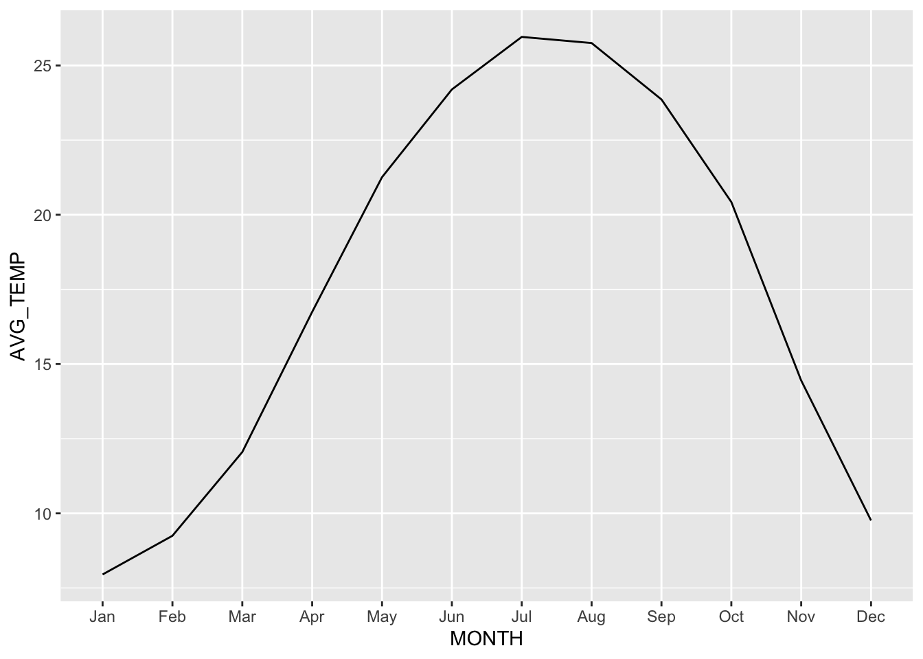 ggplot(aes(x = MONTH, y = AVG_TEMP, group=1)) +