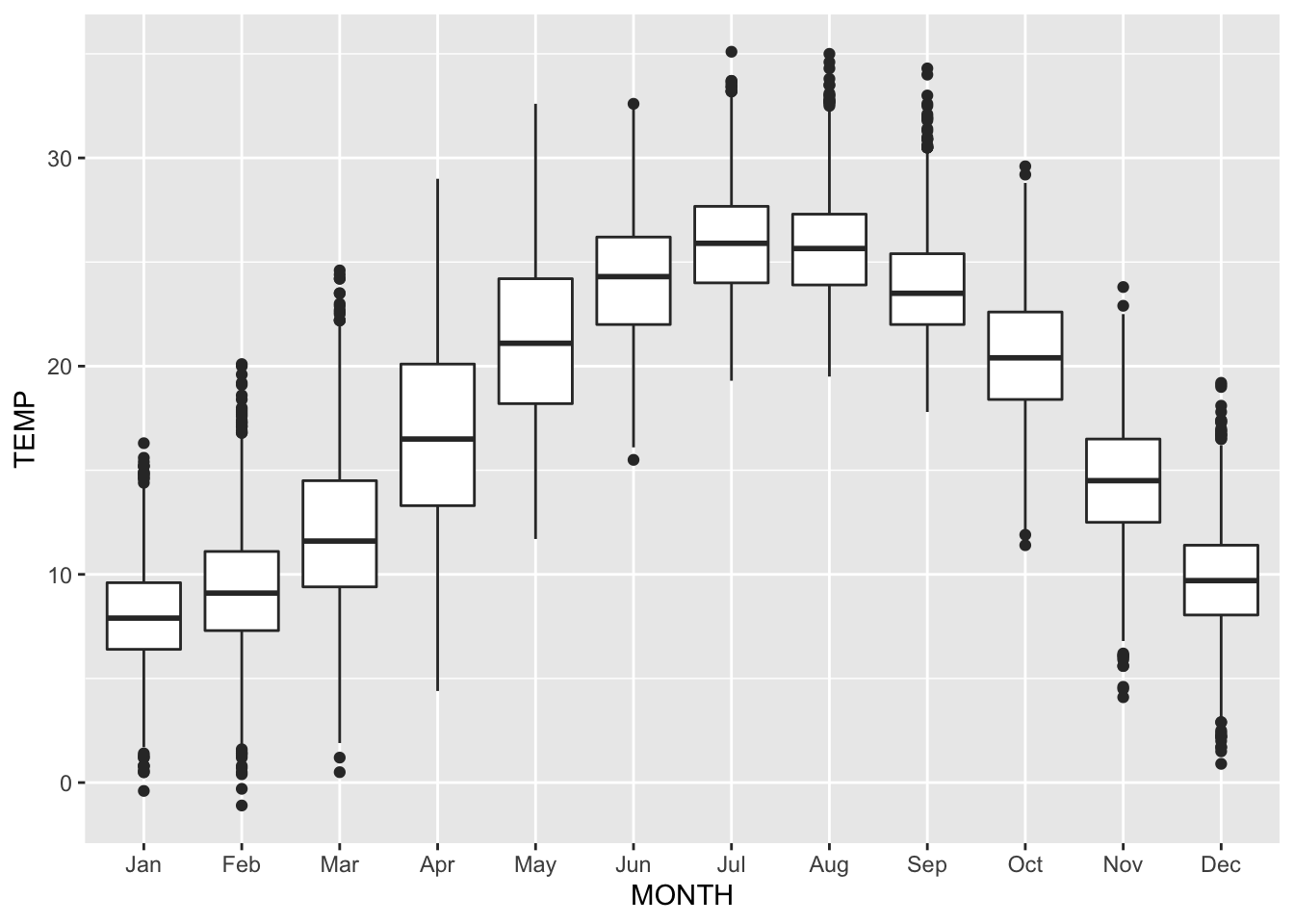 These boxplots are made based on 50 years of data, so the number of data points per boxplot is around 50 times number of days in the specific month.