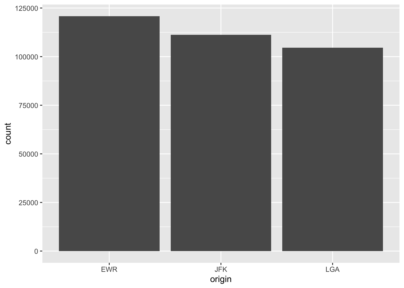 Example barplot, data file: nycflights::flights, variable: origin.