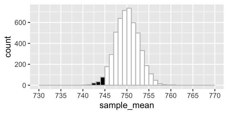 Figure 1. Distribution of the sample means (n = 30) assuming population mean = 750 (the H0 value) and population standard deviation = 15 (estimation based on the sample data). The black area corresponds with the probability of drawing a sample with sample mean less than 745 from this population.