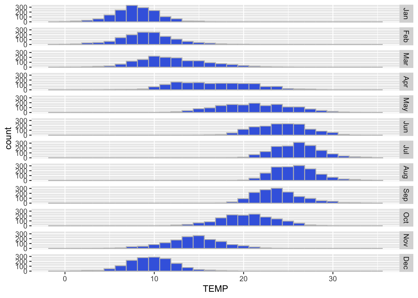 Side-by-side histogram with temperatures, broken down by month.