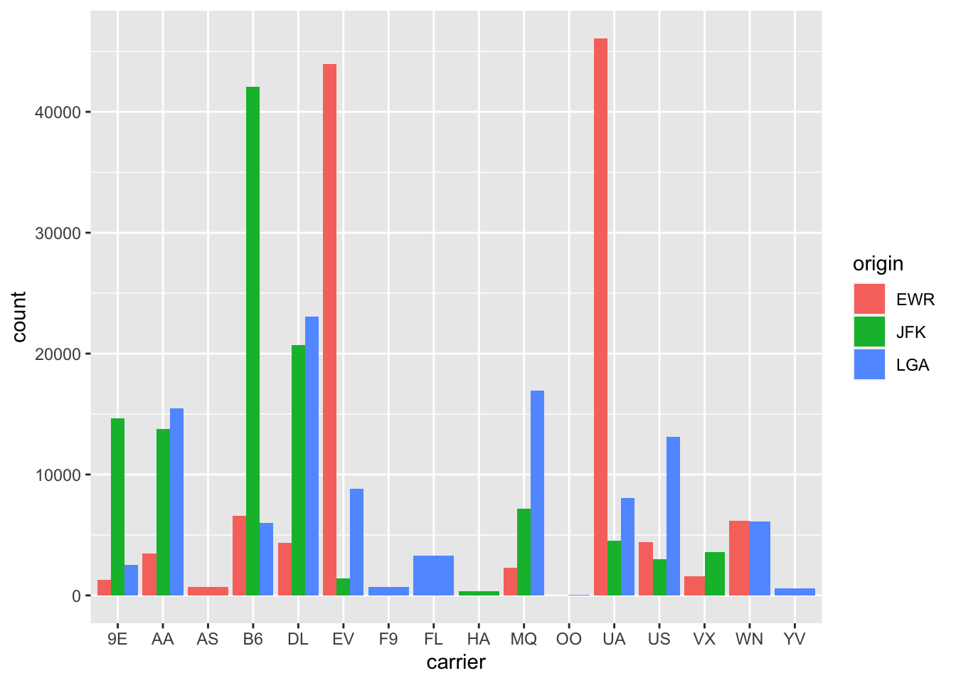 Example barplot, data file: nycflights::flights, variable: origin.
