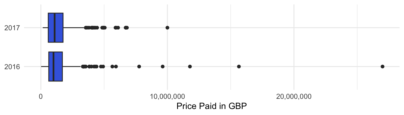 Figure 9.1 Boxplots selling prices houses (GBP) in City of Westminster district in London