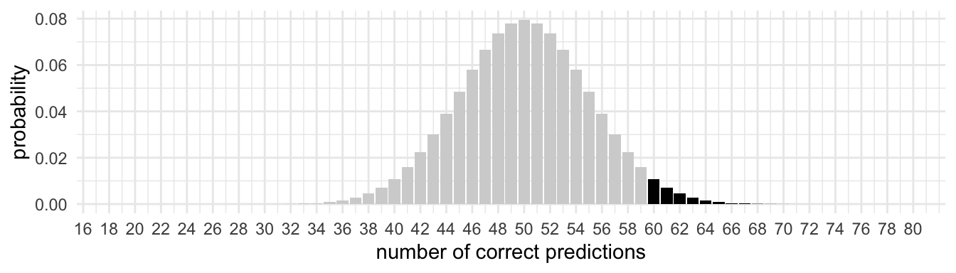 For instance if he predicts correctly 60 out of 100 times the prob-value equals 0.028. The prob-value has been calculated using the R function pbinom(). Another way to calculate this prob_value is by writing code to simulate the experiment assuming H0 is true, repeat this simulations many times (e.g. 10,000) and calculate the proportion of times that 60 or more simulated guesses out of 100 are correct. See the R script