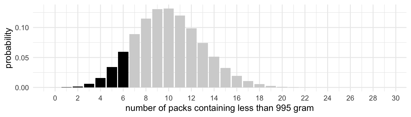 To answer this question we assume the null-hypothesis - H0: 10% of the packages contain less than 995 grams - to be true and calculate the probability to find 6 or less packs with less than 995 grams under this assumption.