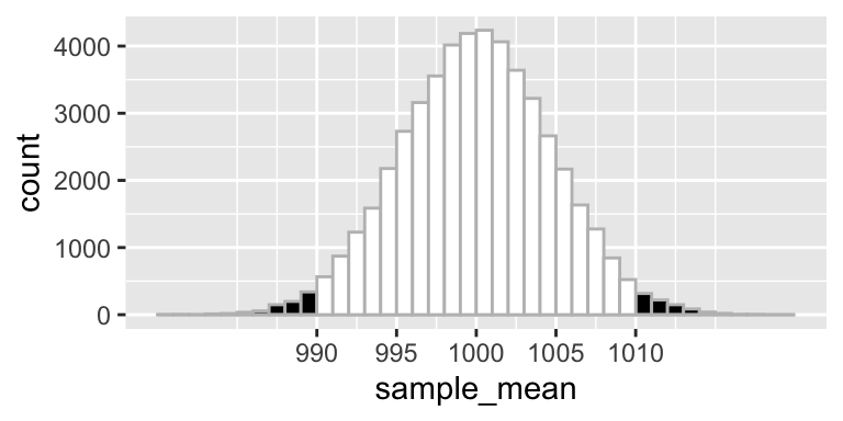 Figure 2. Distribution of sample means (n = 10) from a population with mean = 1000 and standard deviation = 15. The black area represents the P-value of a two sided test, in case the sample mean equals 1010.